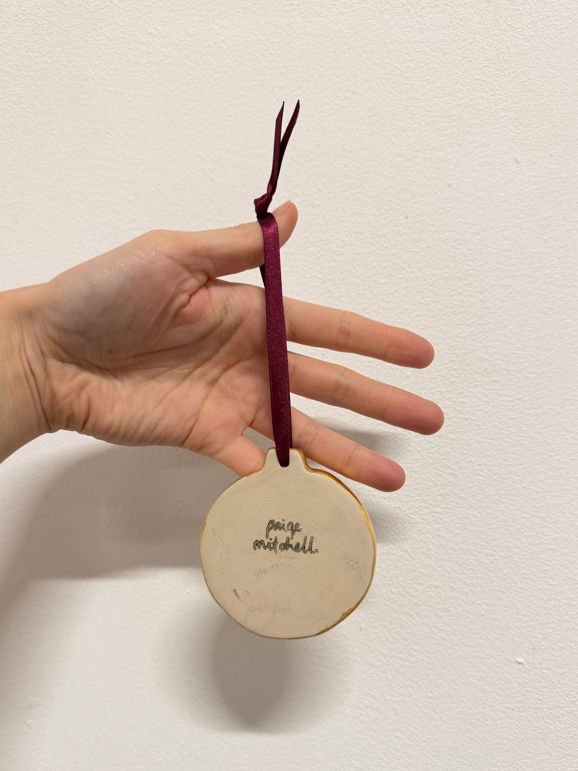 Stoneware decoration made by hand from a slab of white stoneware clay. Cut from a hand rolled slab, smoothed, finished and allowed to dry slowly under wooden boards for a couple of weeks to prevent warping.