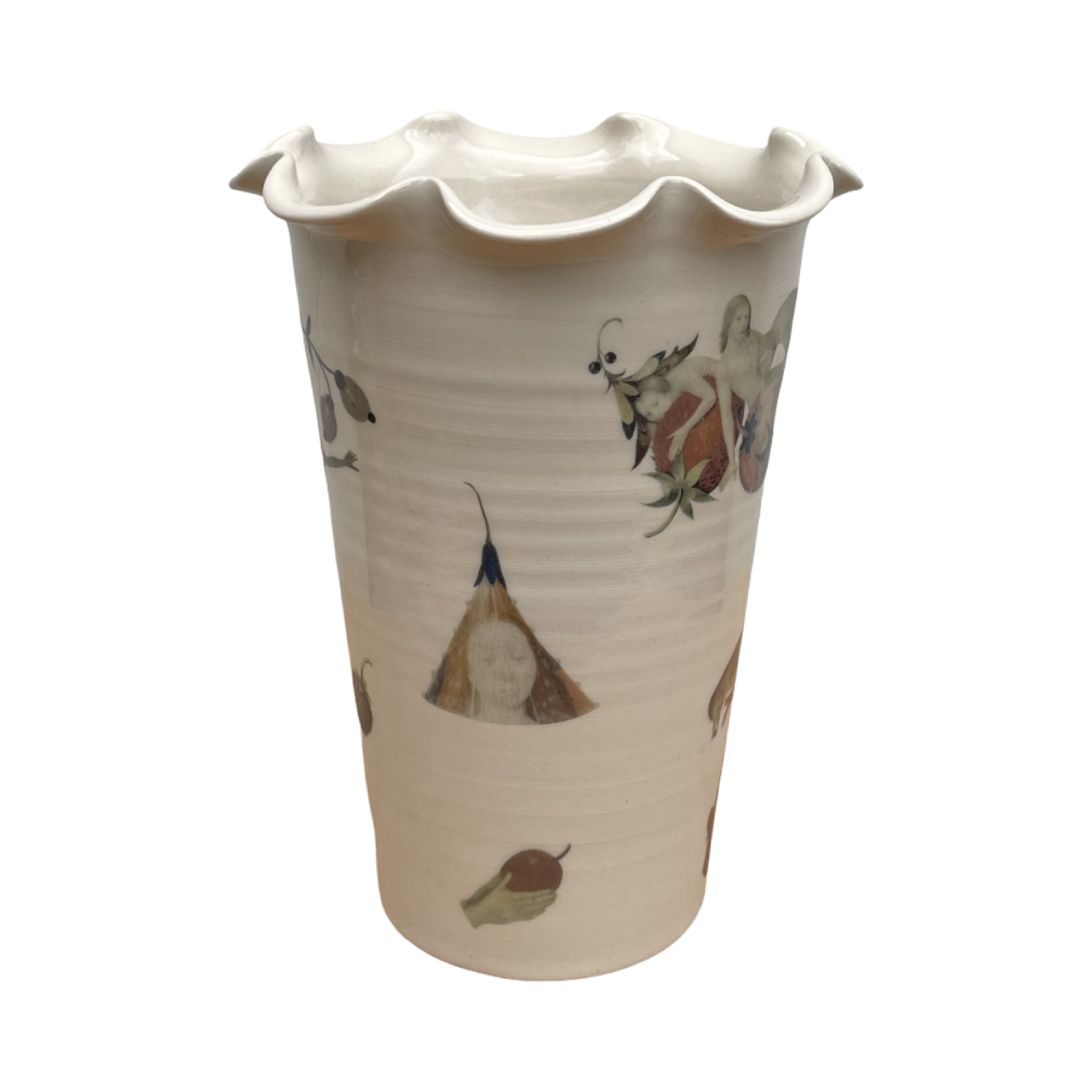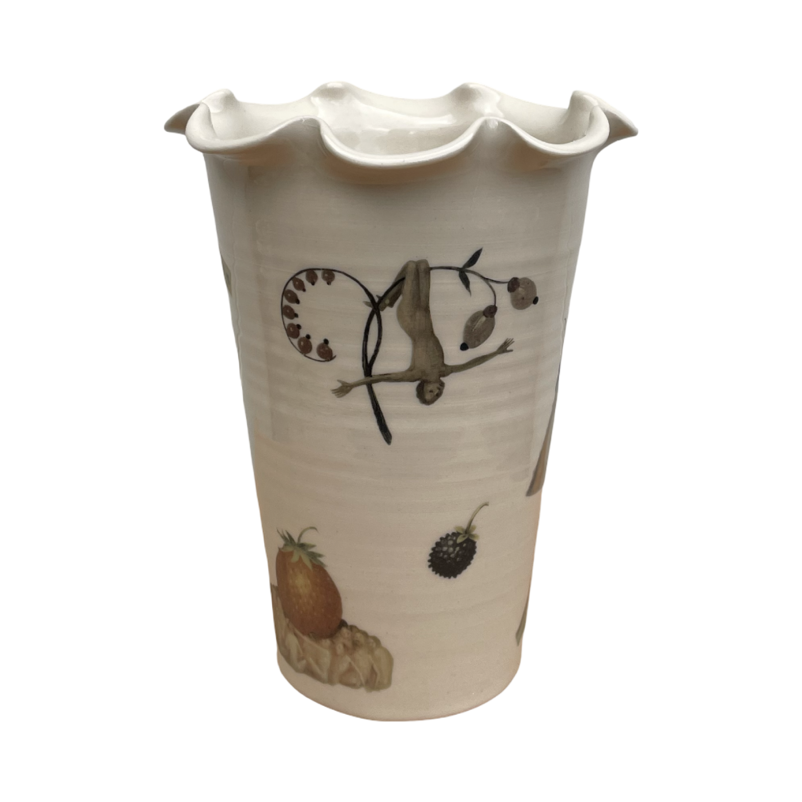 Stoneware vase with a frilly rim. Hand thrown on the wheel and altered by hand.