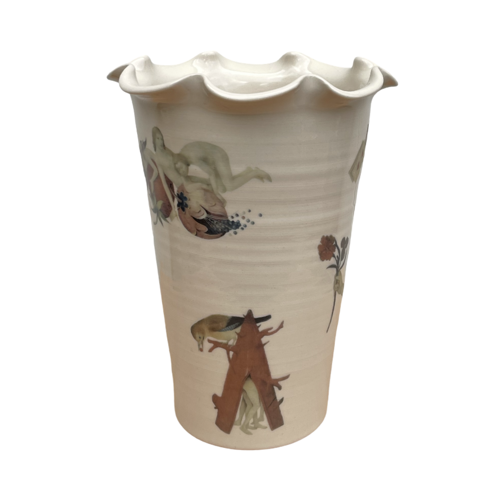 Fired once to 1000 degrees celsius, then signed, waxed, and dipped into a glossy transparent glaze. Once dry the piece is ready for its final 1240 degree firing. Transfers are then cut and individually placed onto the piece and smoothed into place. The piece is then put back into the kiln for its third and final firing.