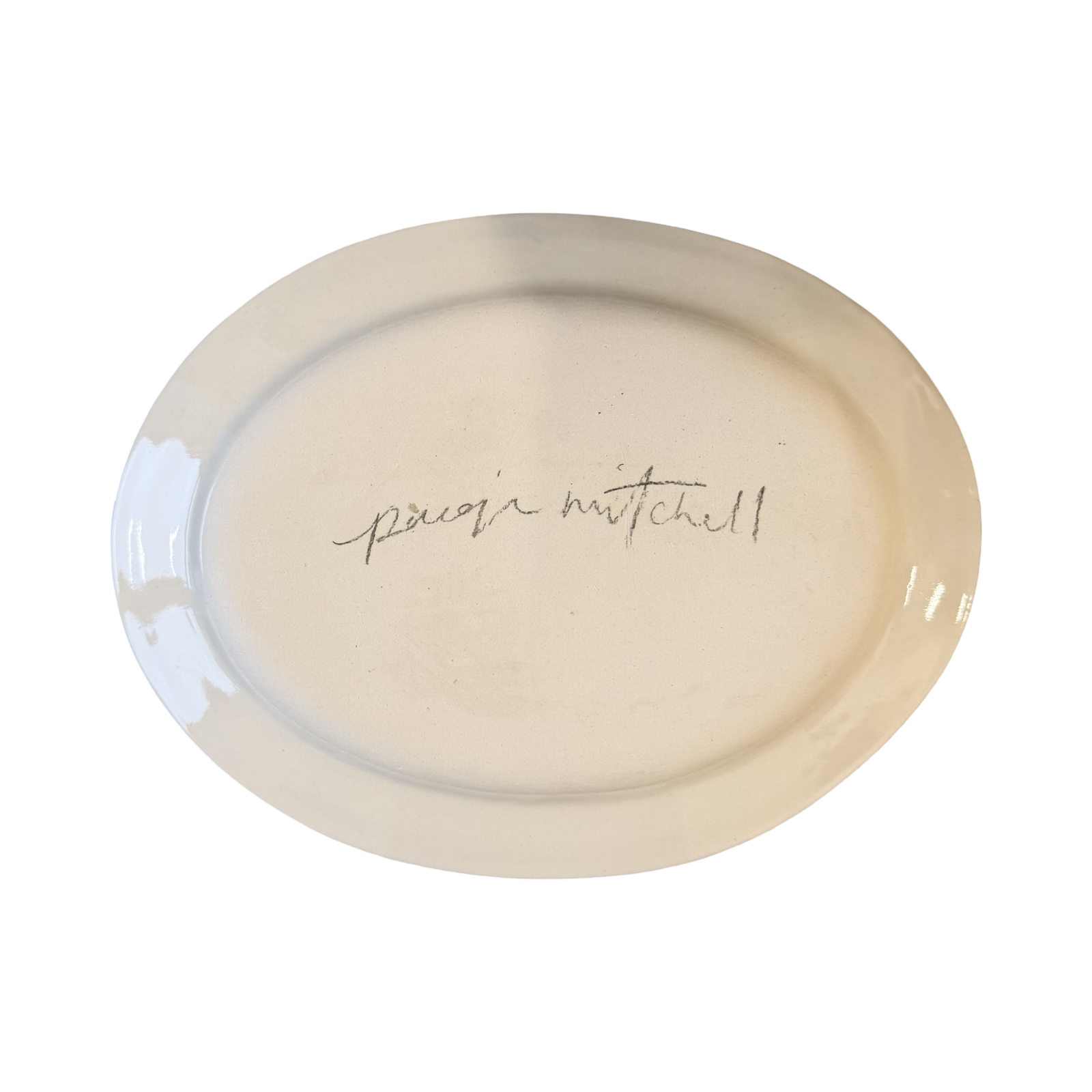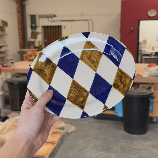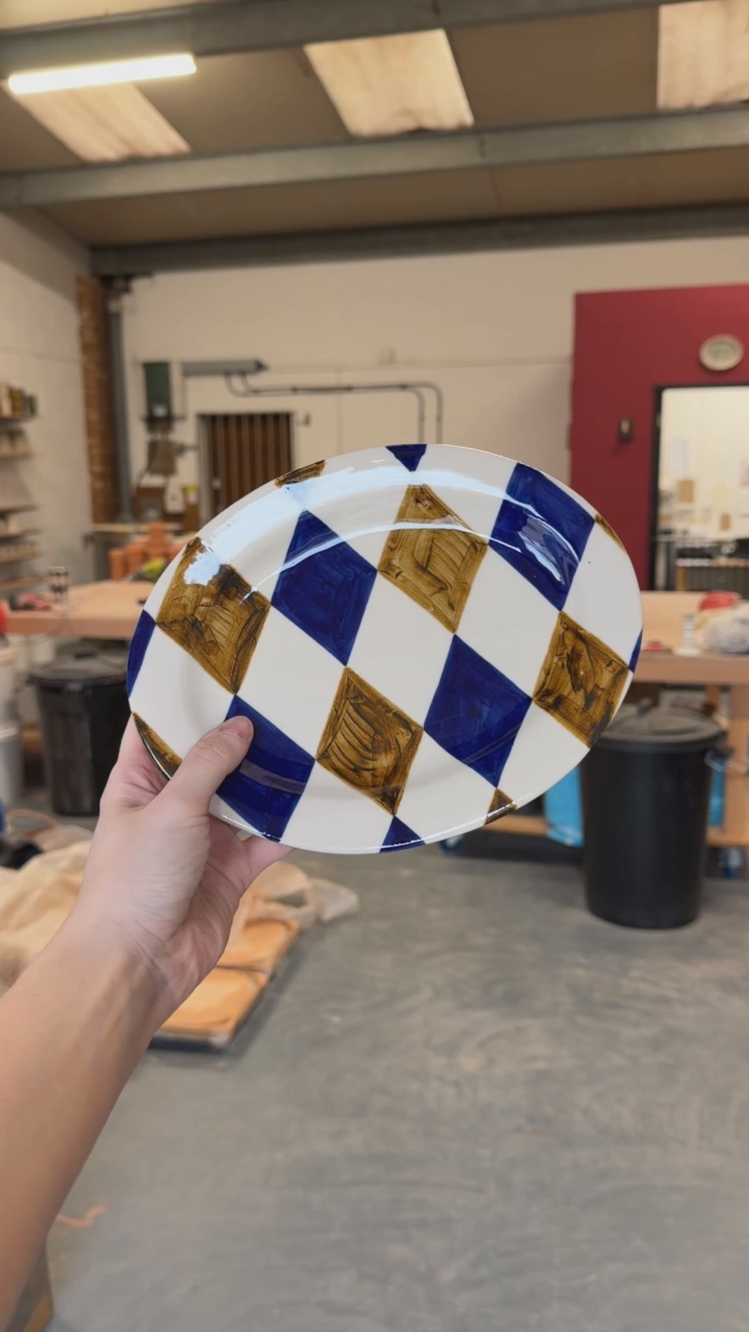 Fired once to 1000 degrees celsius, then signed, waxed, and dipped into a glossy transparent glaze. Decorated by hand using cobalt and iron oxide. Once dry the piece is ready for its final 1240 degree firing.