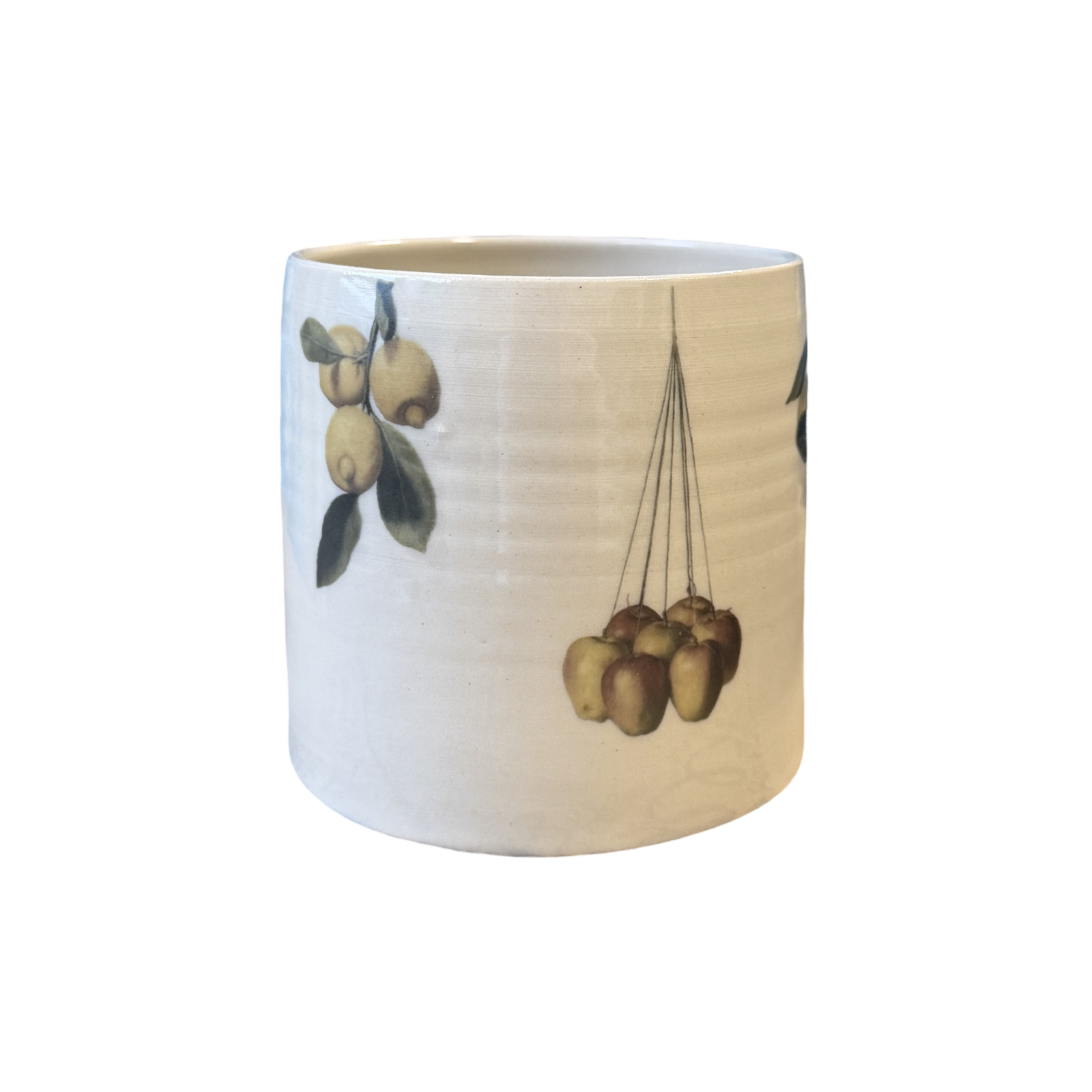 Bisque fired once when dry, stamped, waxed, coated in a transparent glossy glaze. The piece is then placed back in the kiln for its final 1240 degree centigrade glaze firing. Transfers are then cut and individually placed onto the piece and smoothed into place. The piece is then put back into the kiln for its third and final firing.