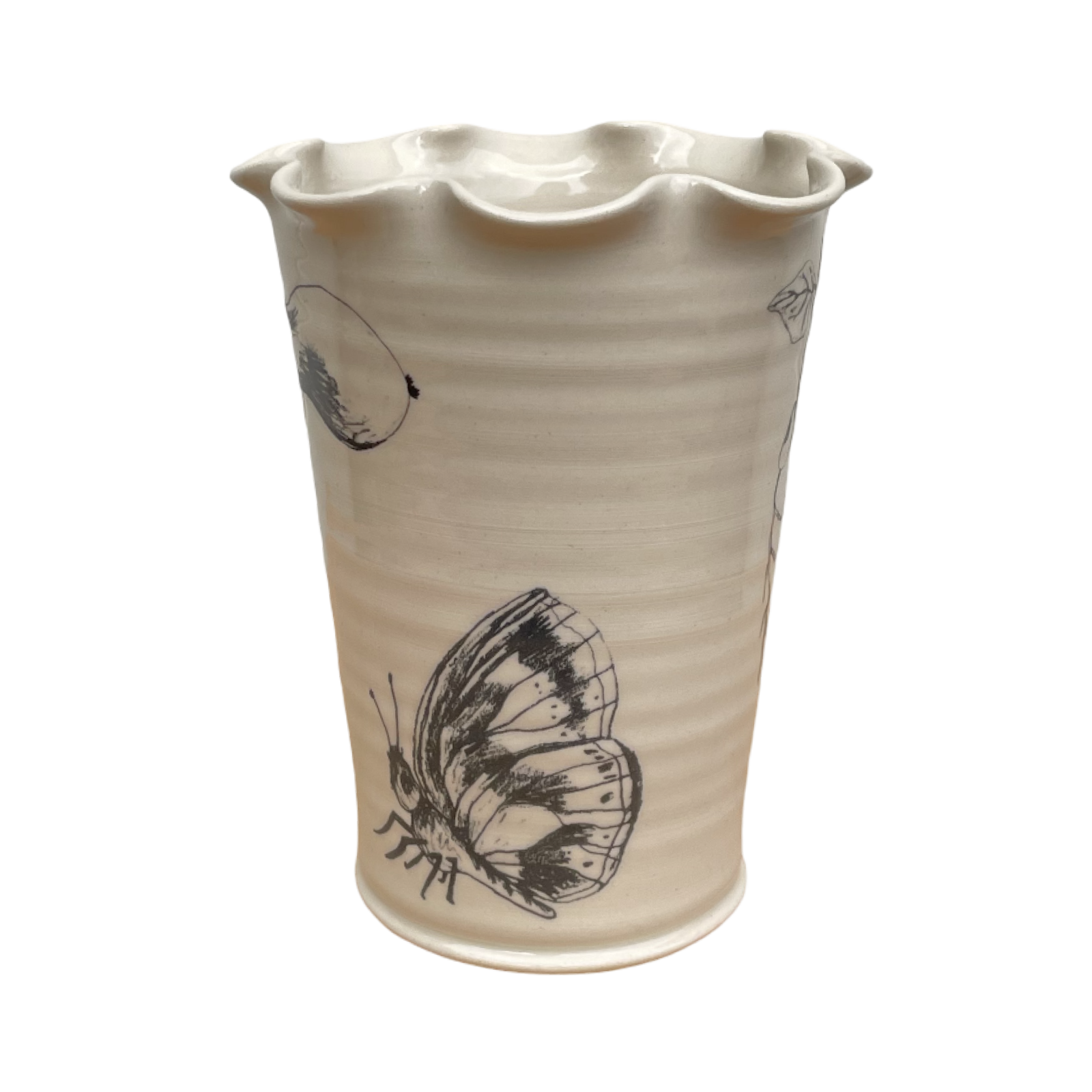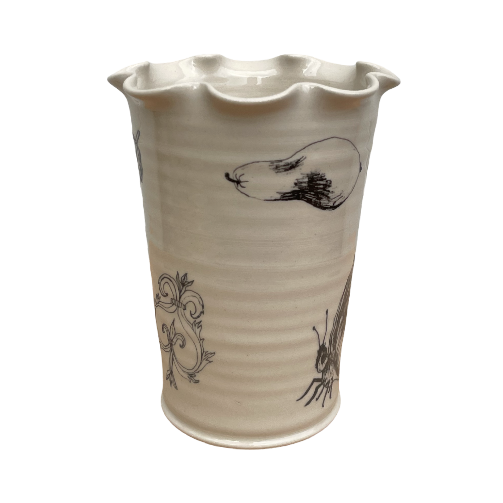 Stoneware vase with a frilly rim. Hand thrown on the wheel and altered by hand.