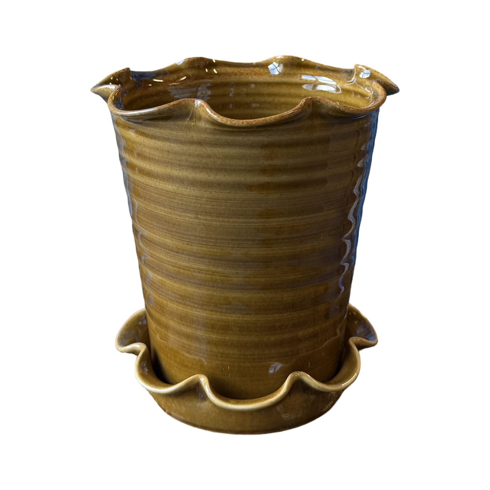 Stoneware pot with a frilly rim thrown on the wheel by hand using an off white stoneware clay with a drainage hole punched into the bottom once leather hard. Fired once to 1000 degrees celsius, then stamped, waxed, and dipped individually into a homemade glossy honey glaze. Once dry the pieces are ready for their final 1260 degree firing.