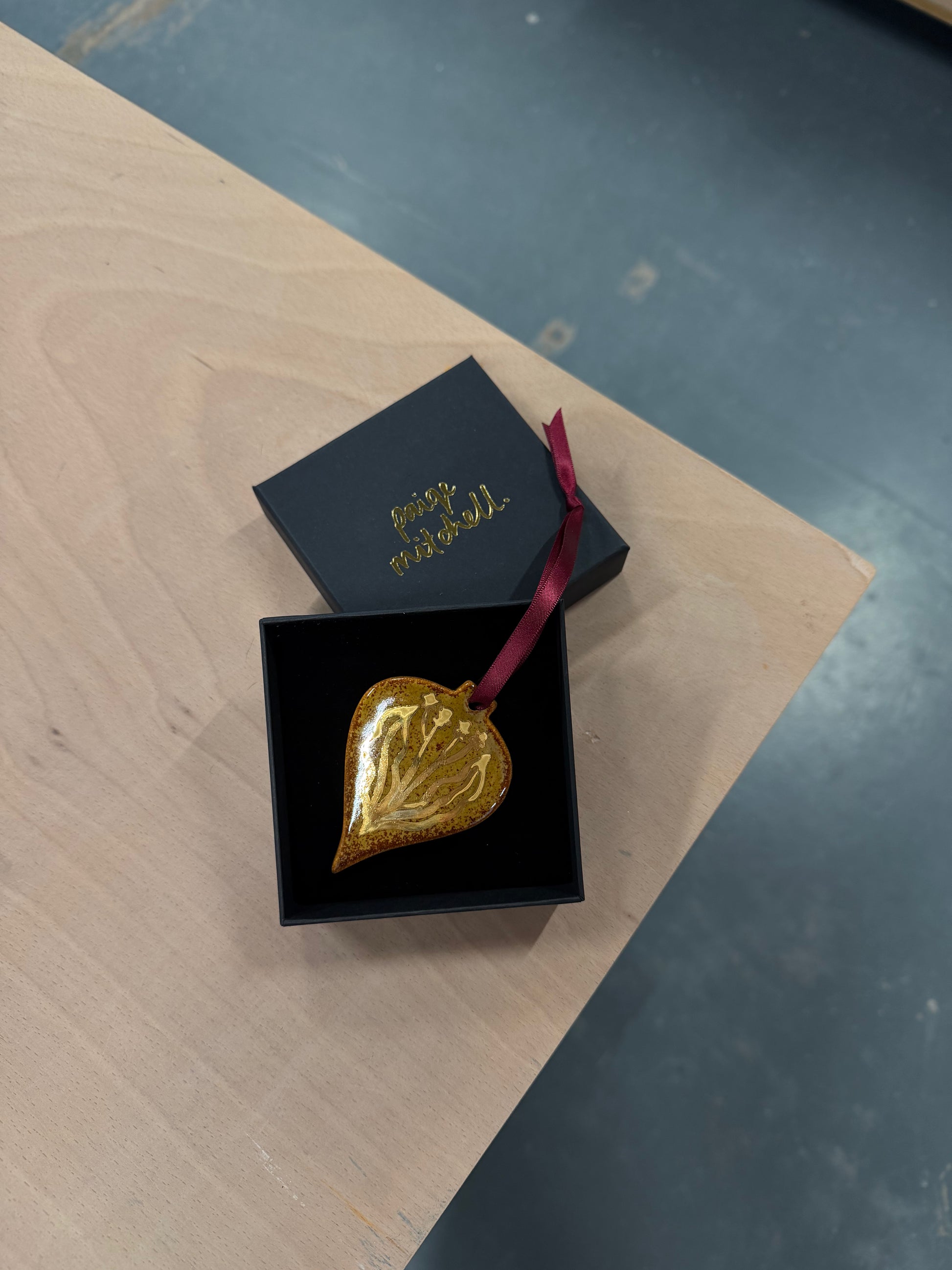 Fired once to 1000 degrees celsius then stamped, waxed, and dipped into a glossy honey glaze, the piece is then ready for its 1240 degree glaze firing. Once fired, the piece is then decorated using gold lustre and fired for a third and final time.