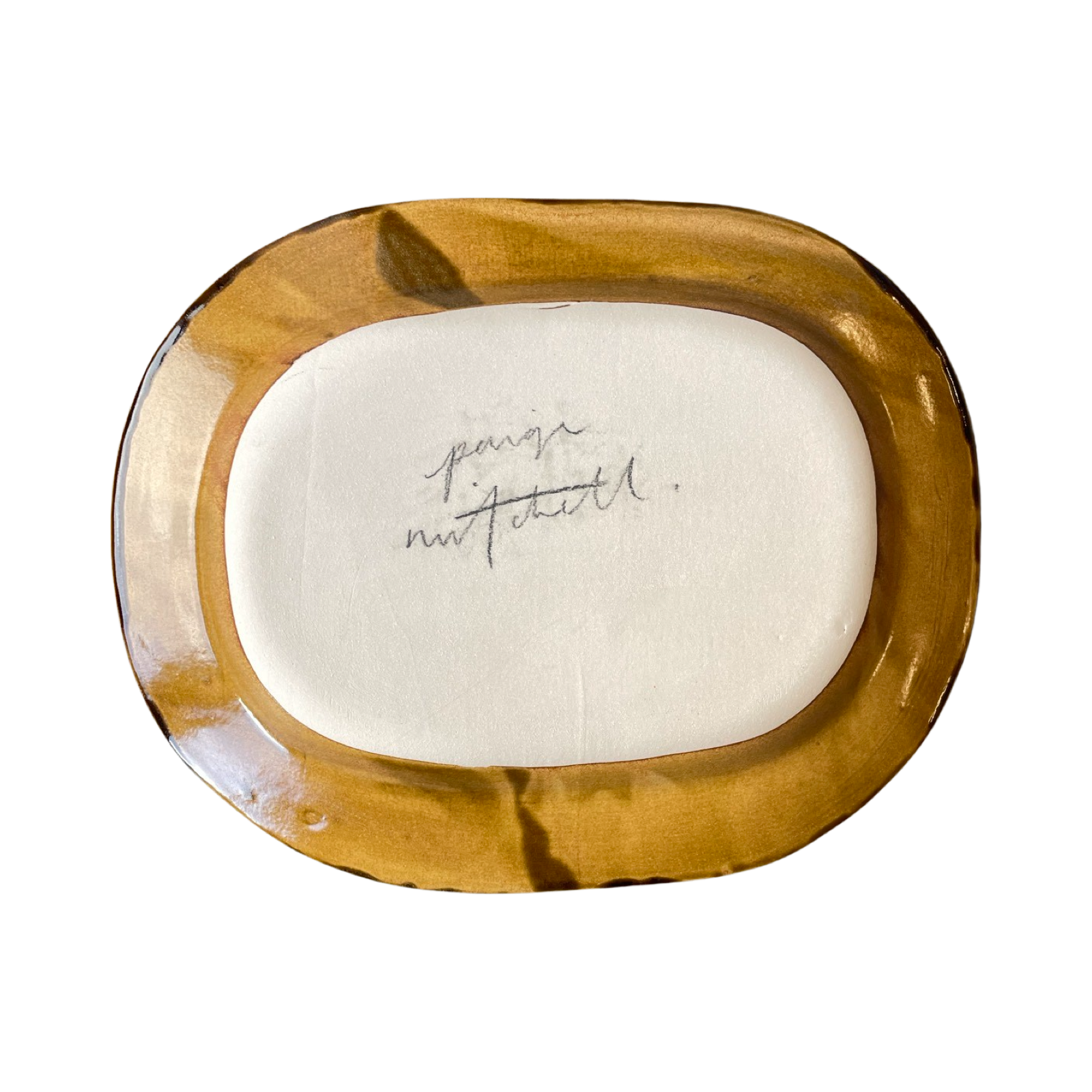 Stoneware platter made by hand from a slab of white clay. Shaped over a mould, cut and smoothed with a rubber kidney. Fired once when dry, then signed and waxed on the base. The piece is then dipped into a home made honey glaze and hand painted with iron oxide. It is then placed back in the kiln for one final 1240 degree centigrade firing.