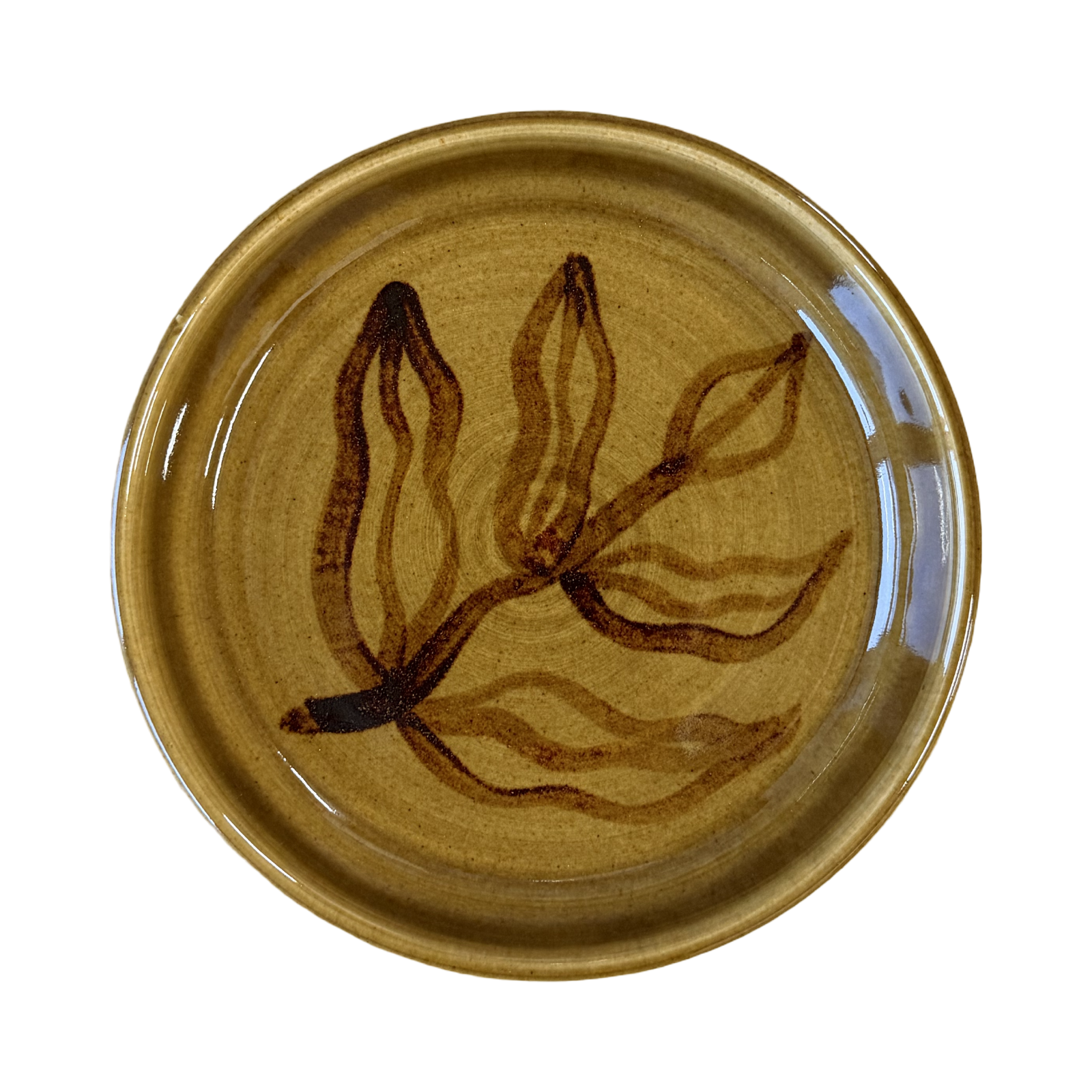 Fired once to 1000 degrees celsius, then stamped, waxed, and dipped into a glossy honey glaze. Decorated by hand using stains and oxides. Once dry the piece is ready for its final 1240 degree firing.