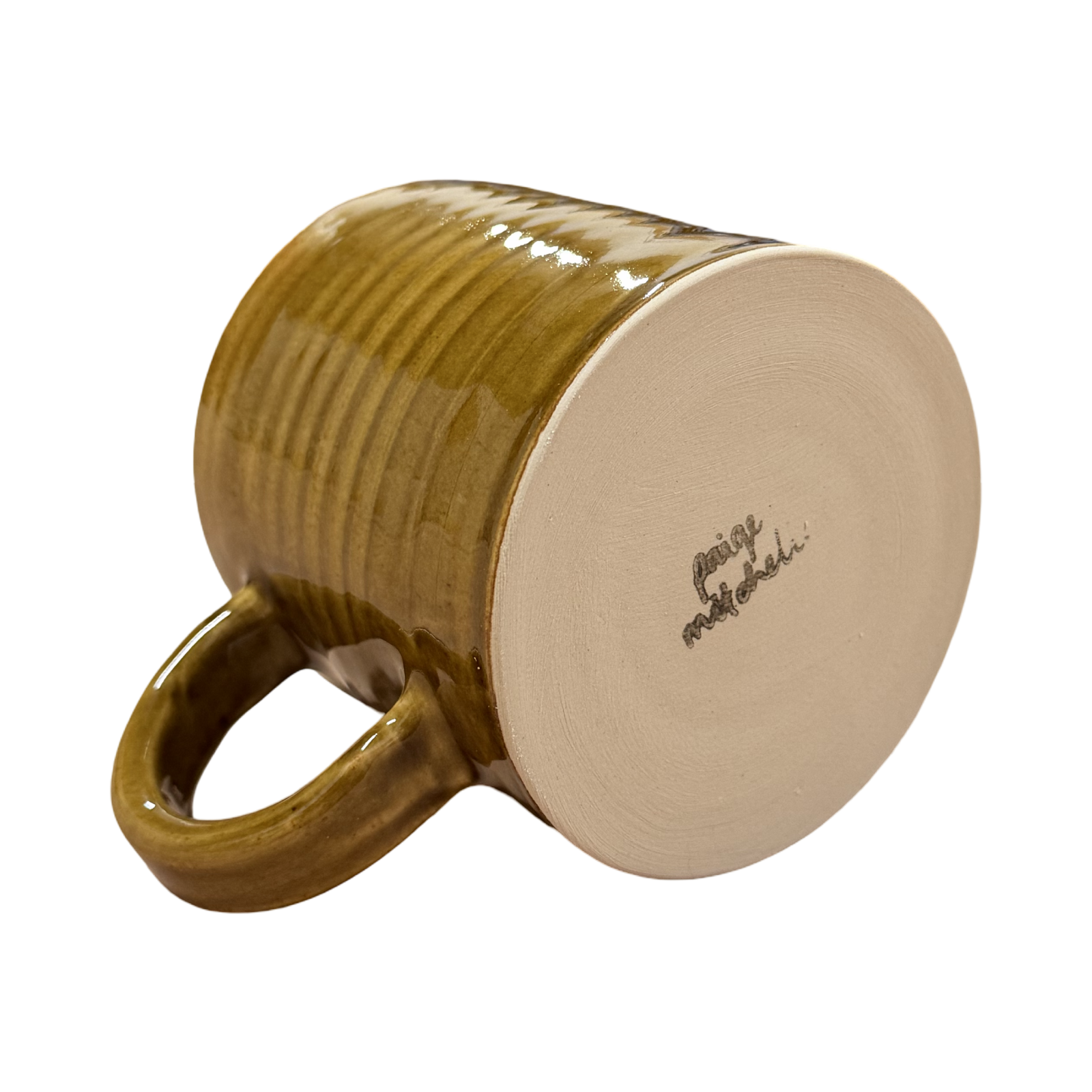 Stoneware mug thrown on the wheel in an off white clay with a handle attached by hand.
