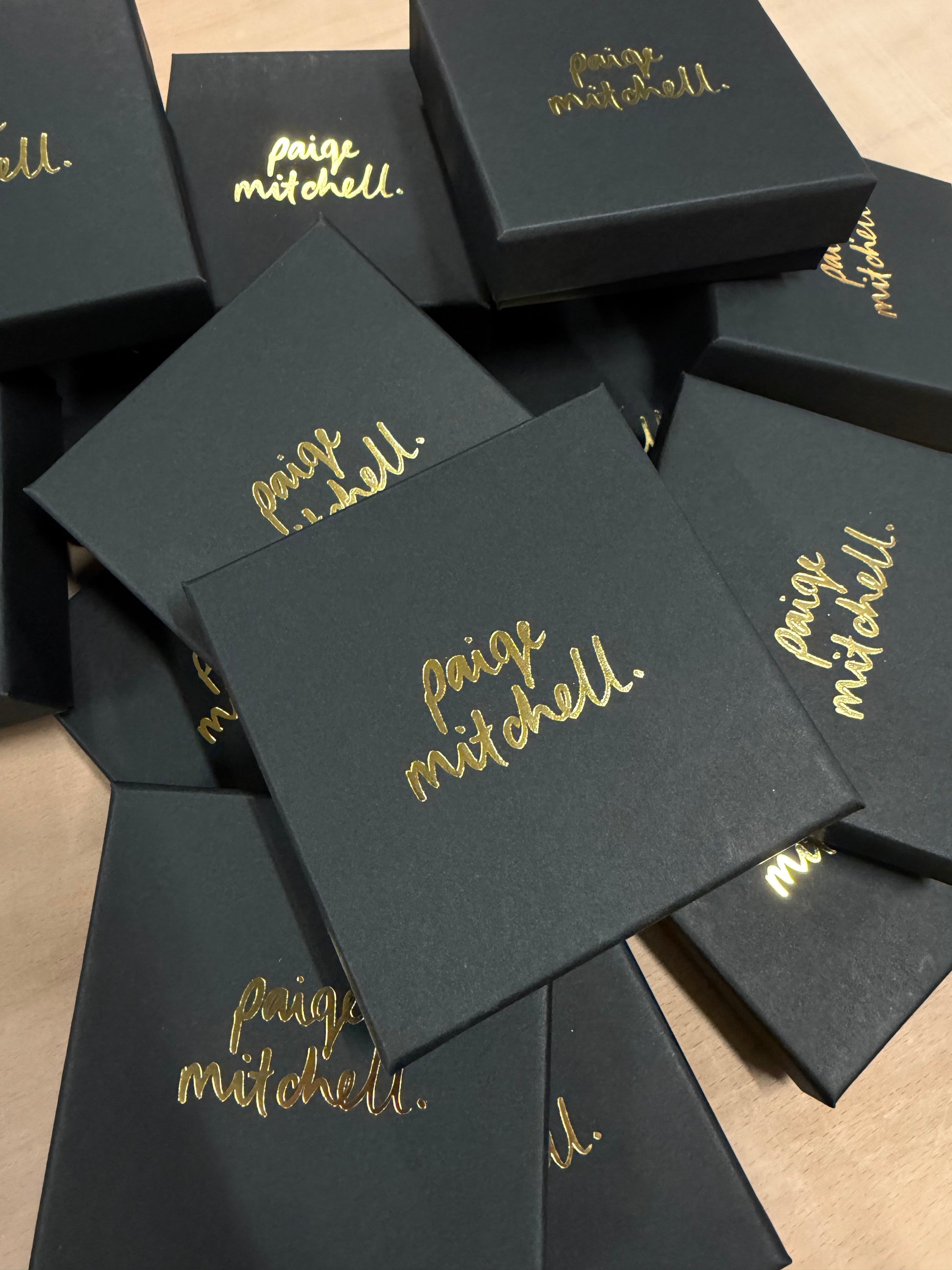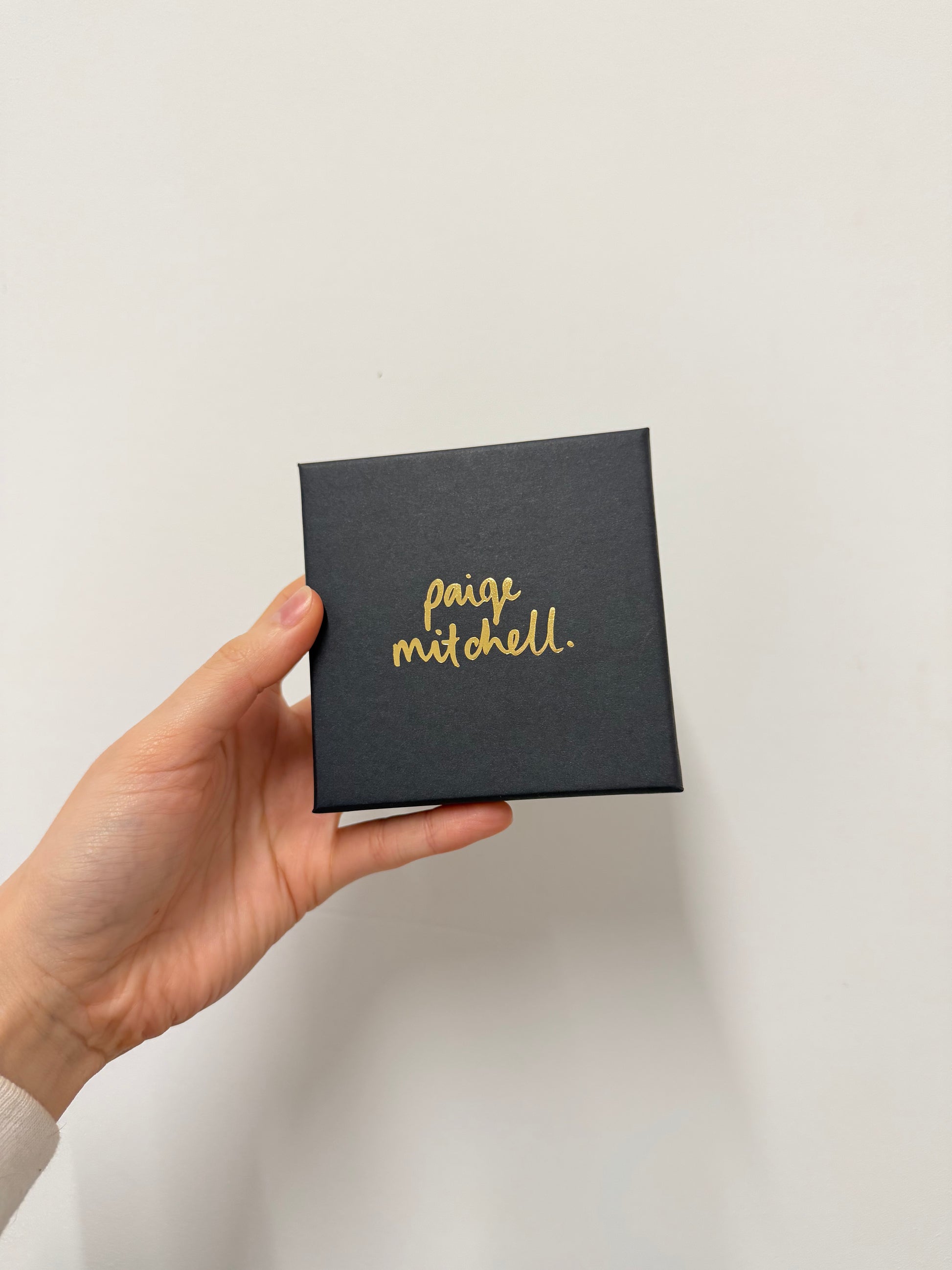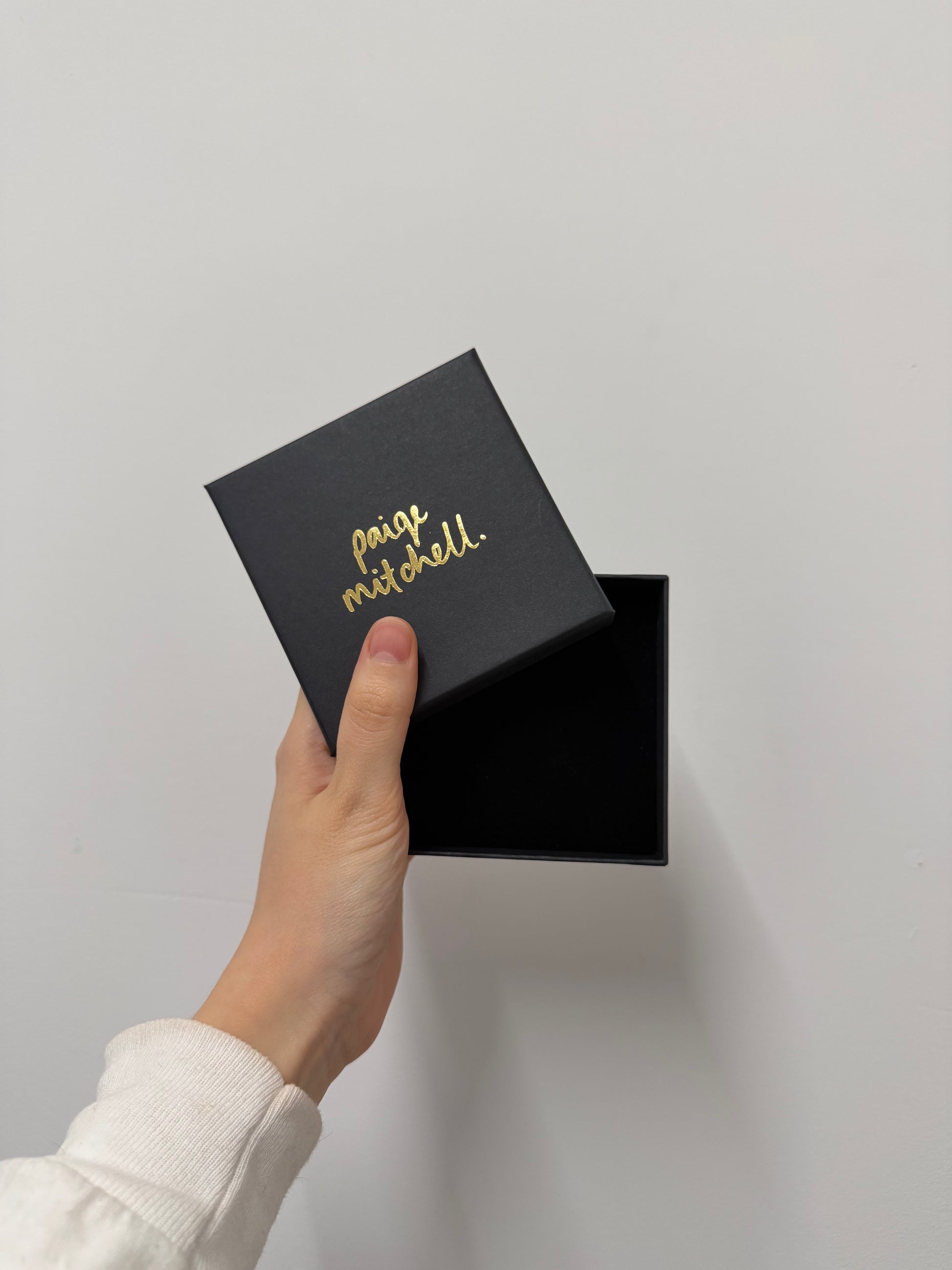 Finished with a yellow gold satin ribbon and a gold foiled keepsake box.
