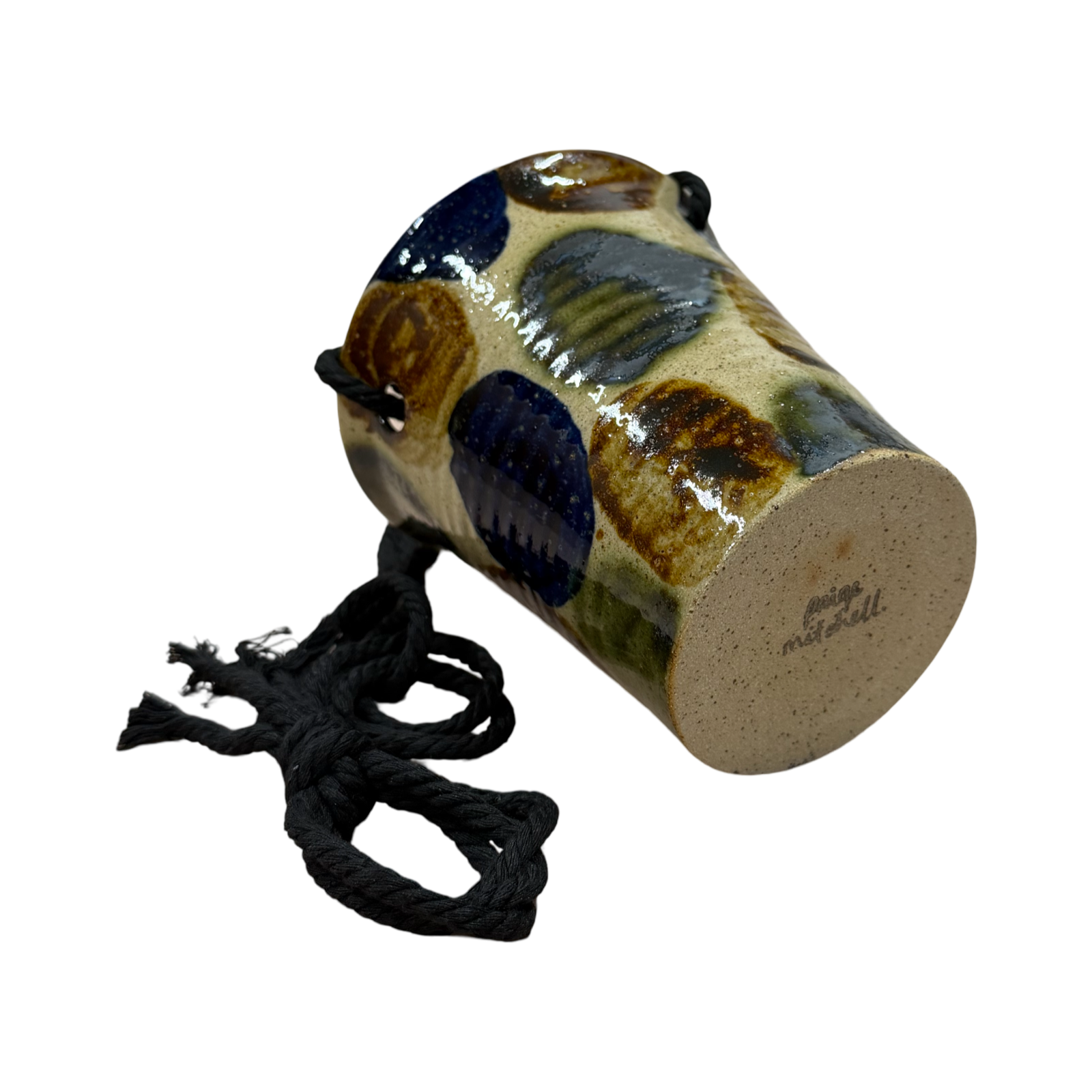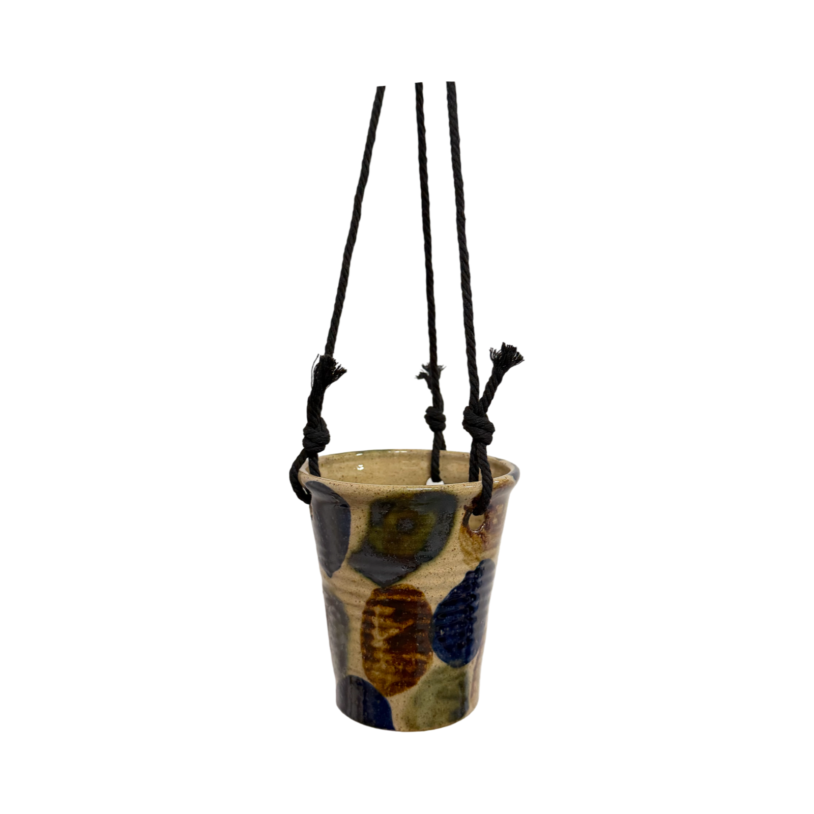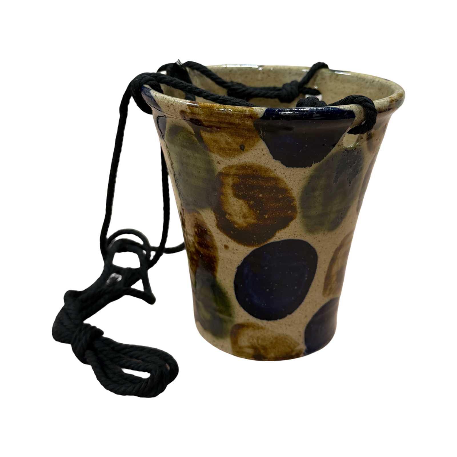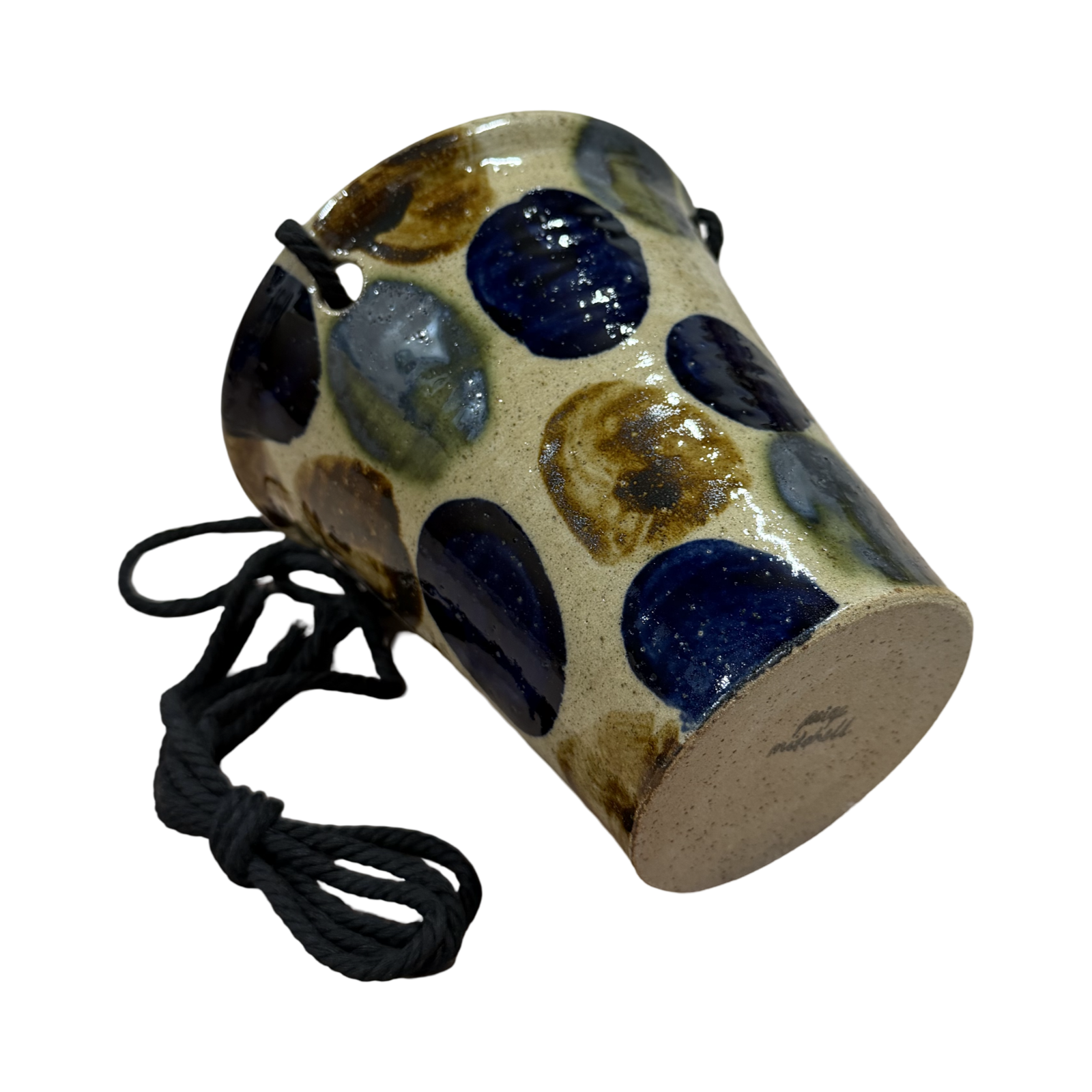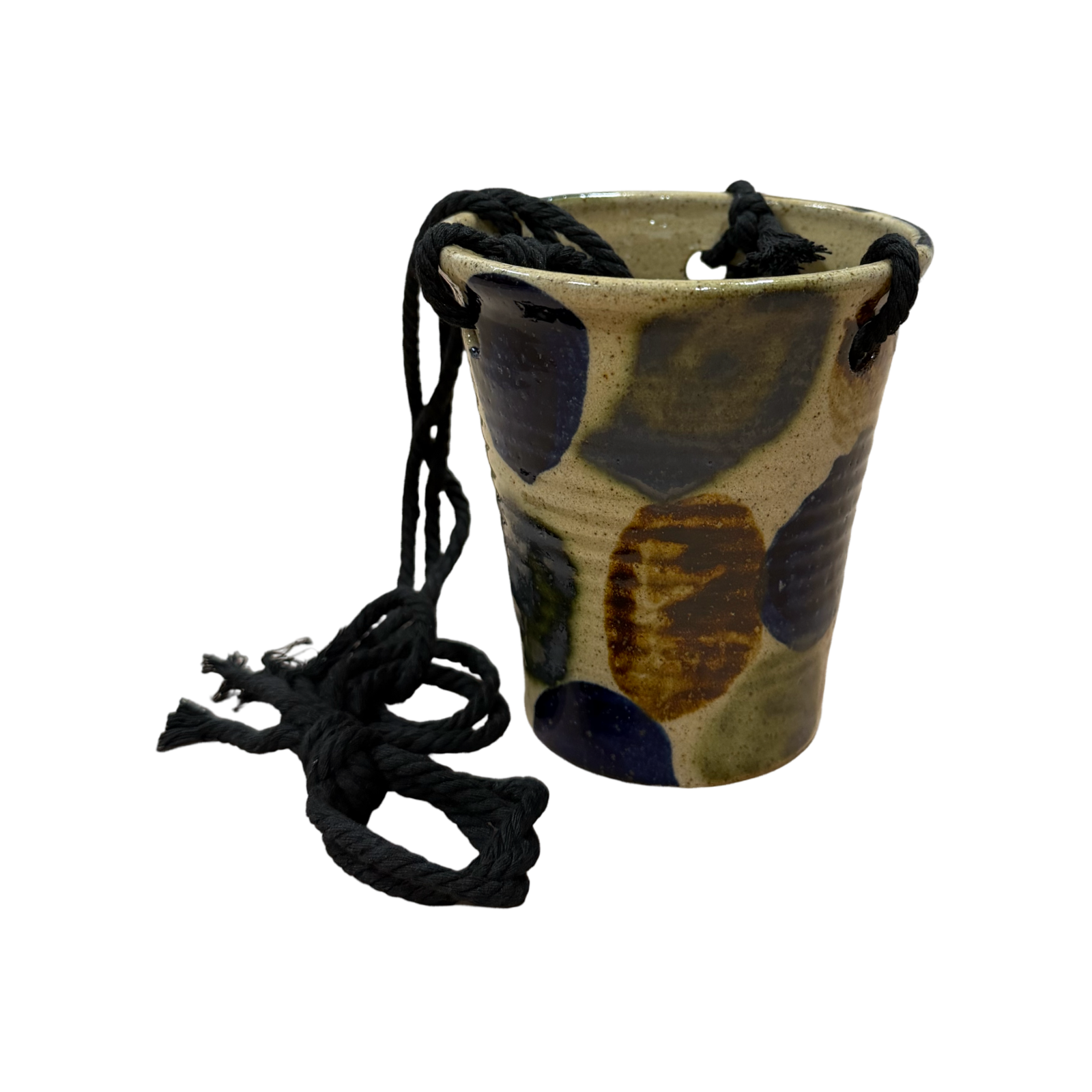 Stoneware pot thrown on the wheel in speckled clay with three holes punched through the rim.