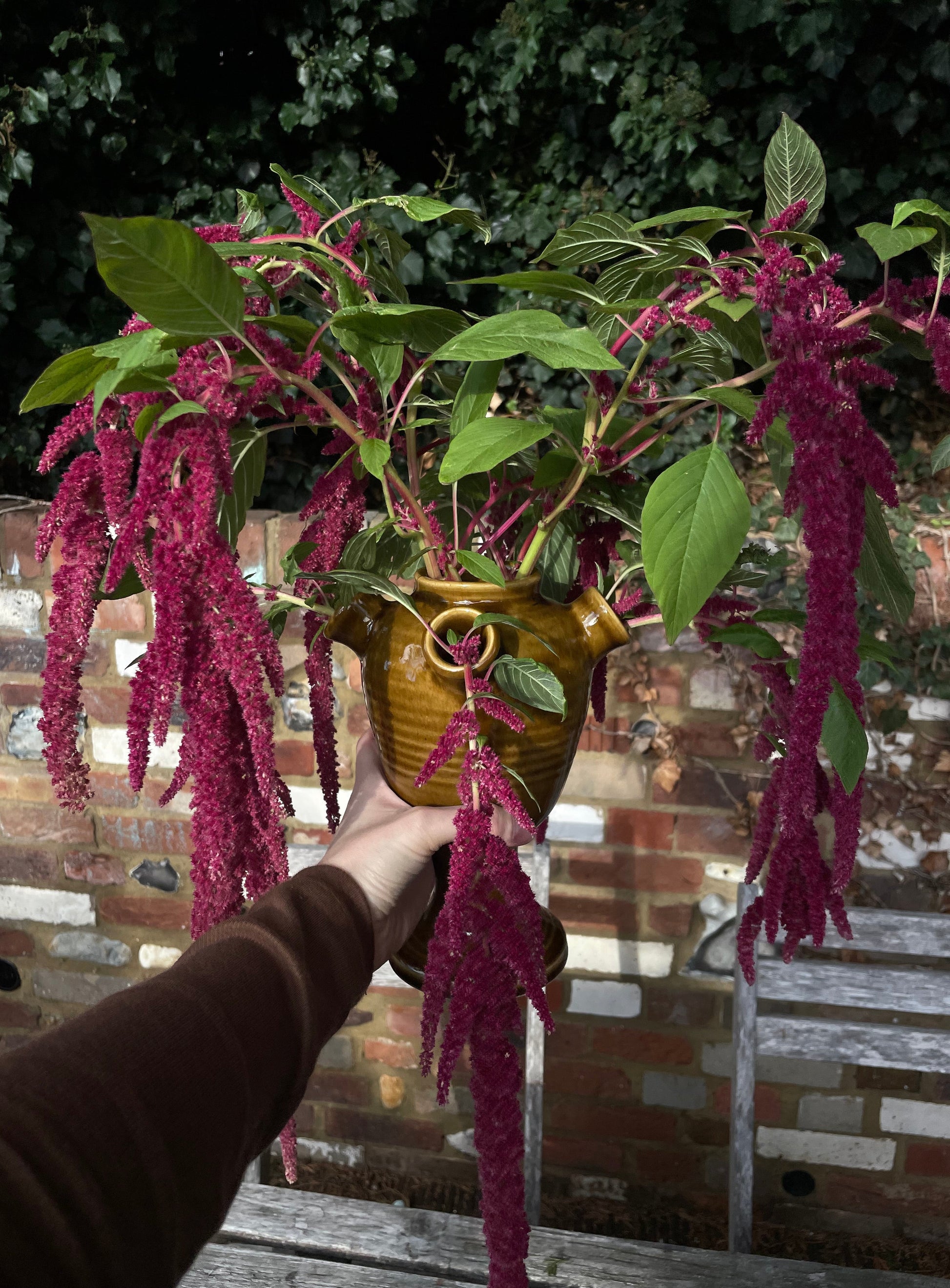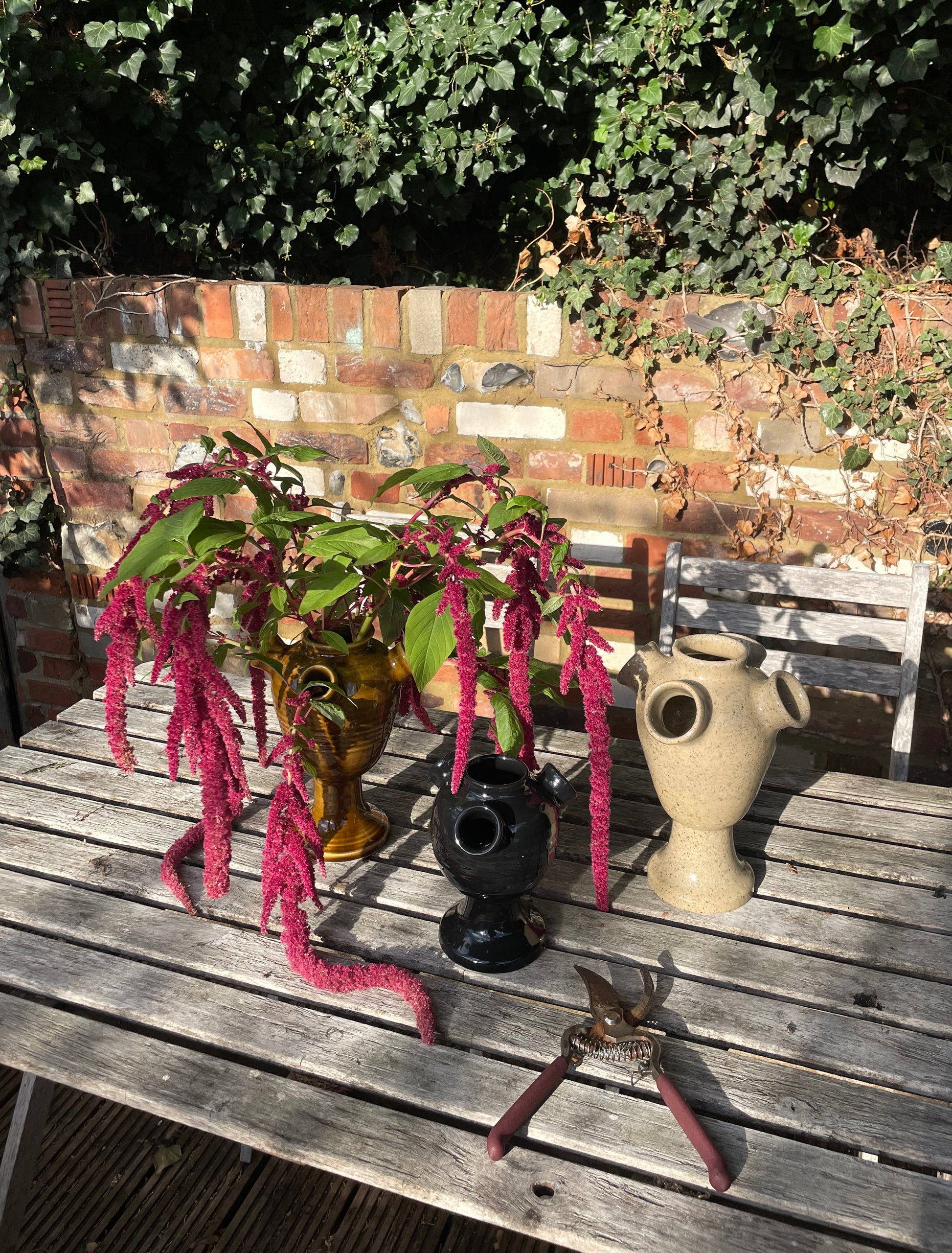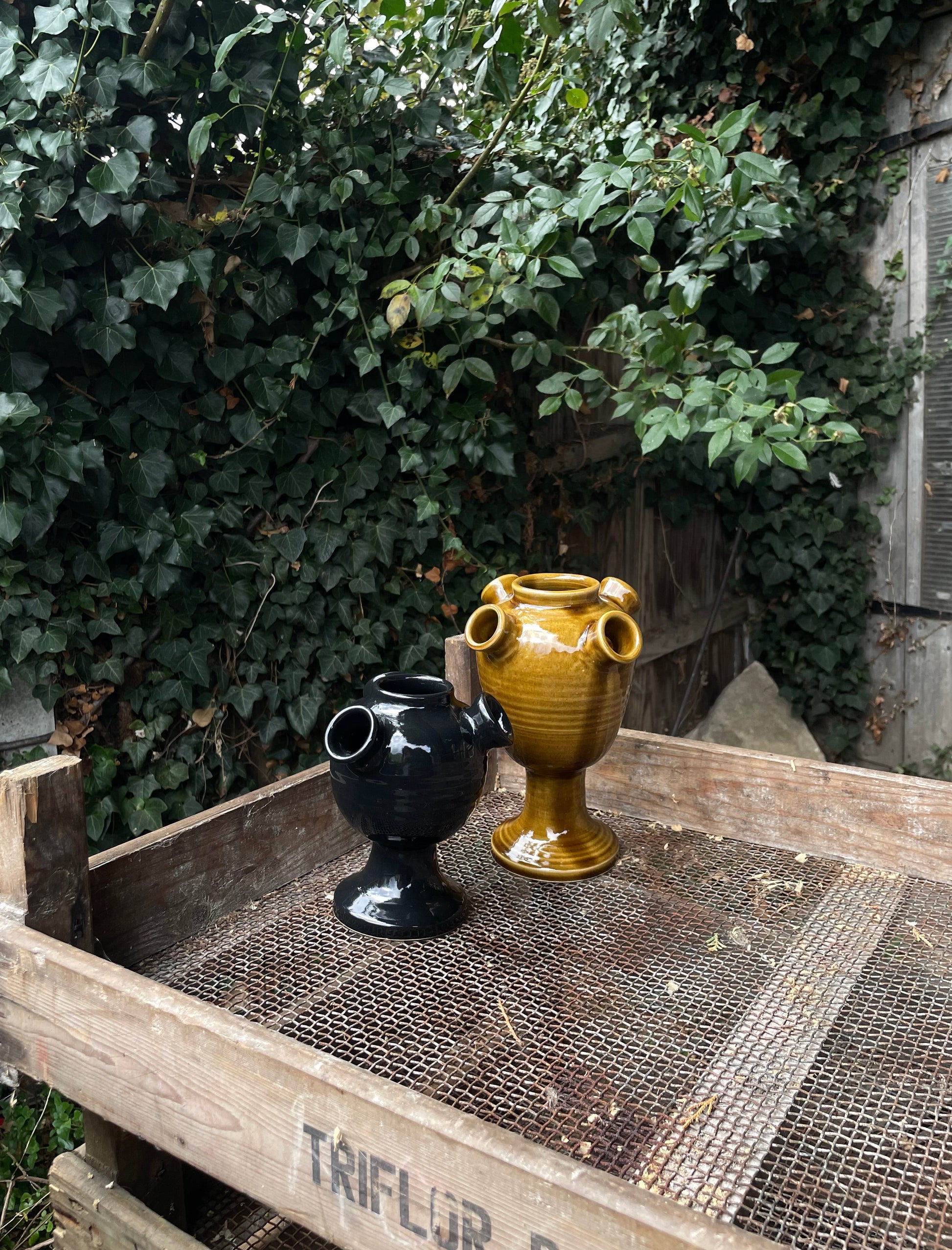 Fired once to 1000 degrees celsius, then signed, waxed, and dipped into a homemade glossy honey glaze. Once dry the piece is ready for its final 1240 degree firing.