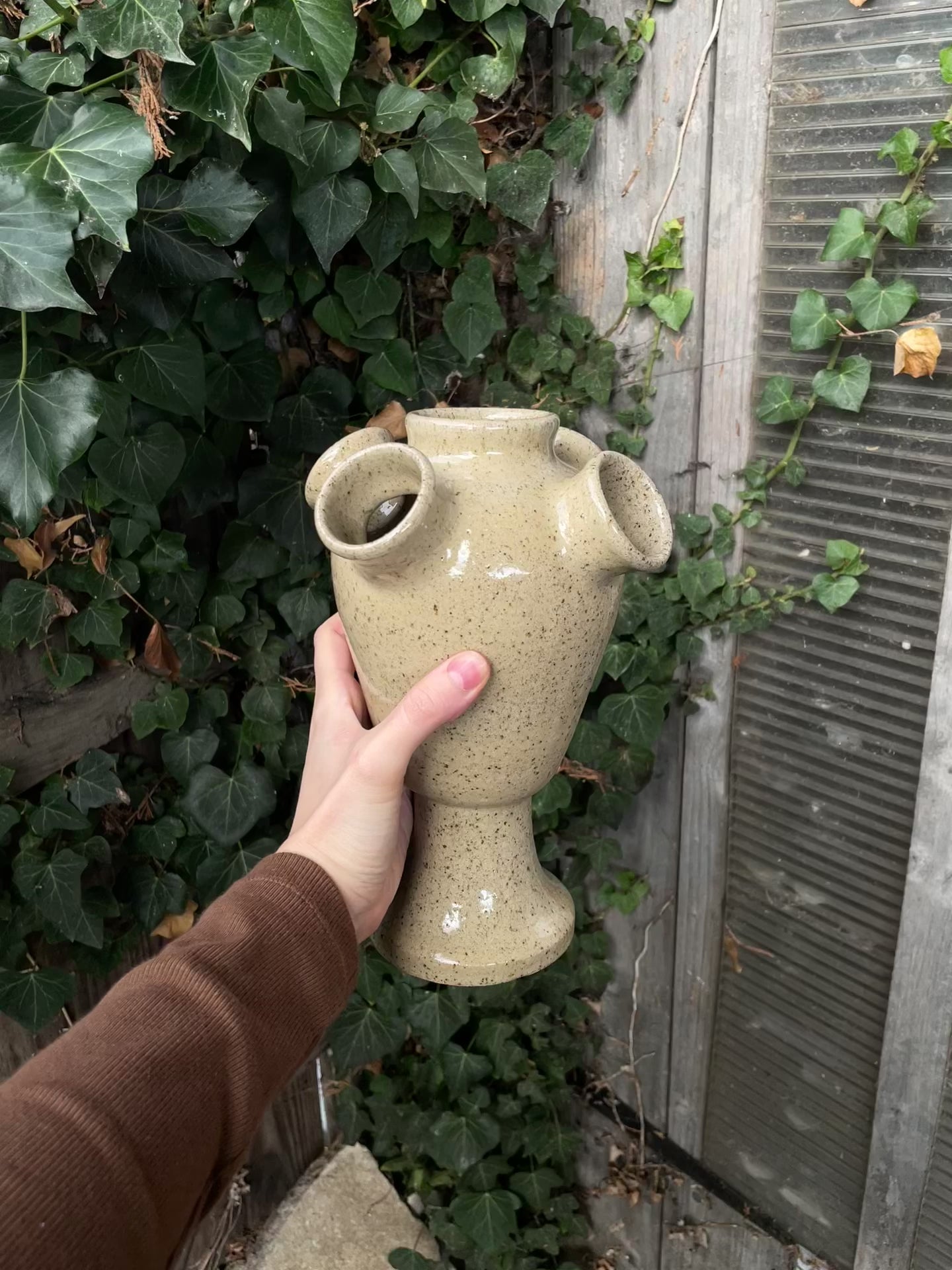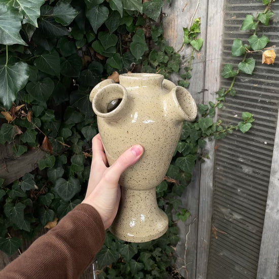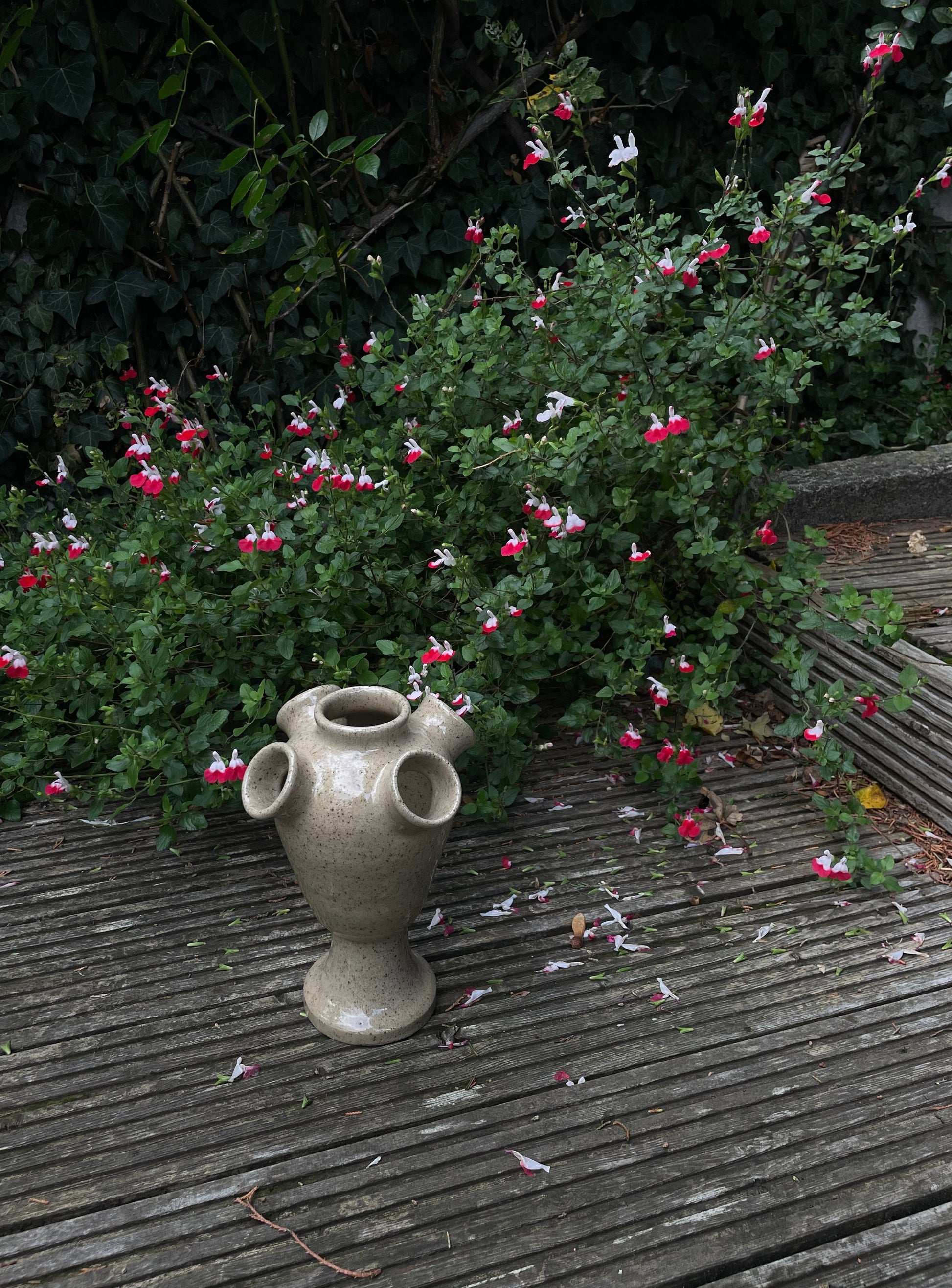 Stoneware footed tulipiere, hand thrown on the wheel in a speckled stoneware clay in several parts. Pieced together by hand once each piece is leather hard, smoothed, finished and allowed to dry slowly under plastic wrap for several weeks.