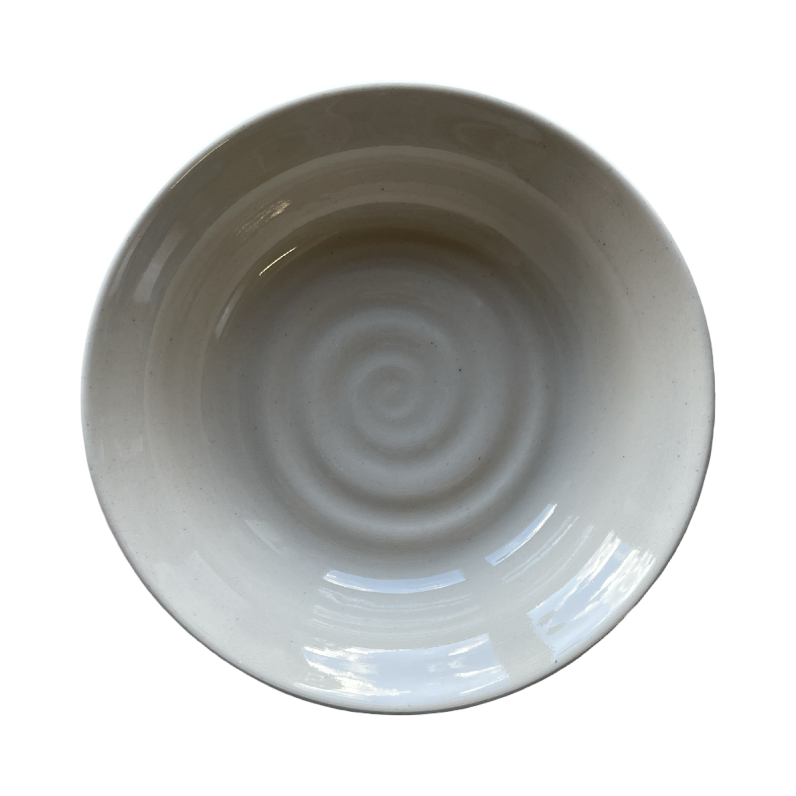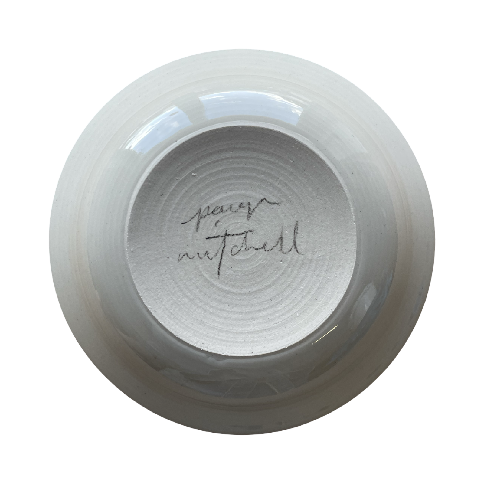 Fired once to 1000 degrees celsius, then signed, waxed, and dipped into a glossy transparent glaze. Once dry the piece is ready for its final 1240 degree firing.